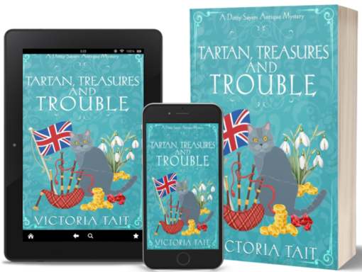 Tartan, Treasures and Troubles is the 12th book in veteran author Victoria Tait’s awesome cozy Dotty Sayers Antiques Mystery series and picks up with Dotty’s return to the Cotswolds and her home at Meadowbank Farm and job at Akeman’s antiques business. She and her best friend, Sergeant Keya Varma, have teamed up to host a traditional Burns night dinner at the Waterwheel Café at the auction house, but the sudden death of one of the attendees was very much NOT on the menu.