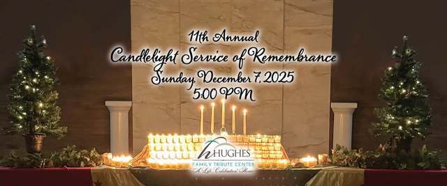 On Sunday, December 7, 2025, the Hughes Family Tribute Center will host a Candlelight Service of Remembrance. Families can expect to find comfort through music, light refreshments, a small service, and the lighting of candles in honor of loved ones. Whether you have lost a spouse, parent, child, grandparent, sibling, or friend, there is a place for you to find warmth during our candlelighting. We will have an English service starting at 5:00 PM and a Spanish service at 6:30 PM.