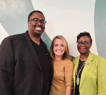 TXWF Ripple Reception David Simpson (Camp Fire First Texas), Karen Hughes White (TXWF president and CEO), Yolanda Willis (Camp Fire First Texas)